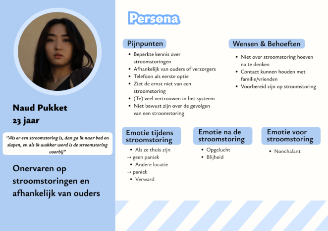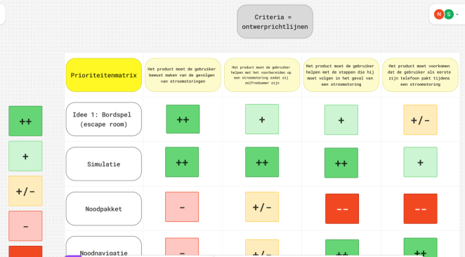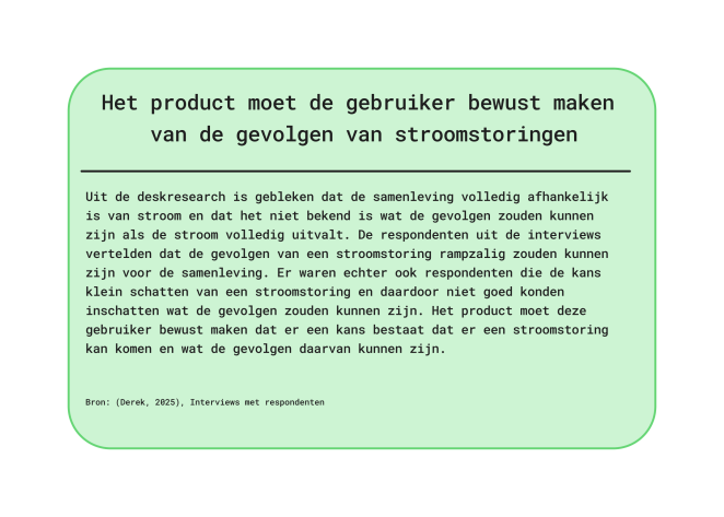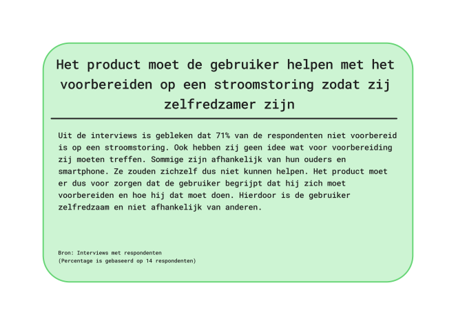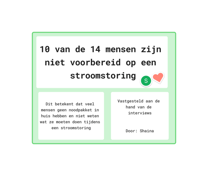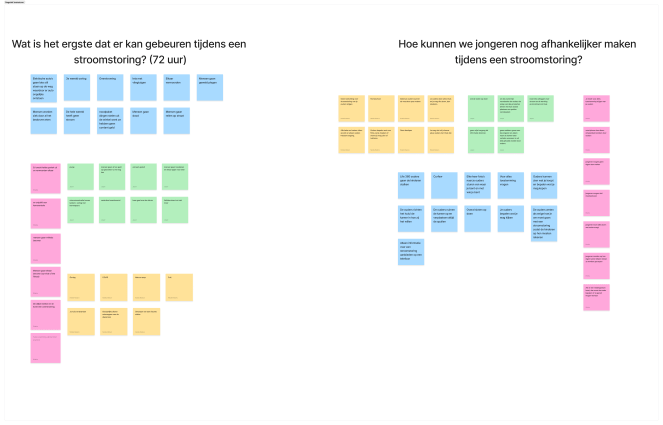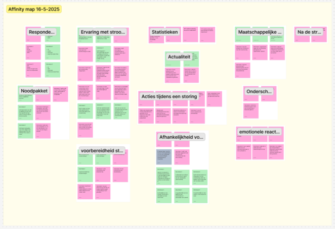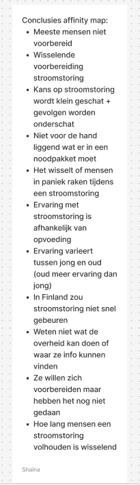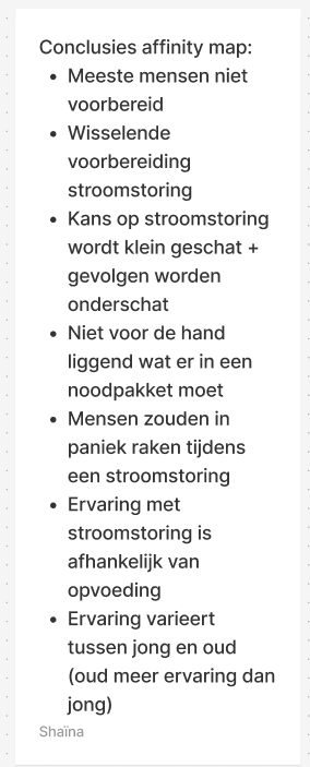 Uit de affinity map kwamen schokkende resultaten. De meeste mensen zijn niet voorbereid op een landelijke stroomstoringen en hebben geen noodpakket in huis. Ook word de kans op een stroomstoring klein ingeschat. Als de ramp wel zou gebeuren, dan zouden veel mensen in paniek raken. Het was interessant om te ontdekken dat er een verschil was tussen jonge en oude respondenten. Jonge respondenten, onder de 30 jaar, hadden minder ervaring met rampen dan ouderen.
