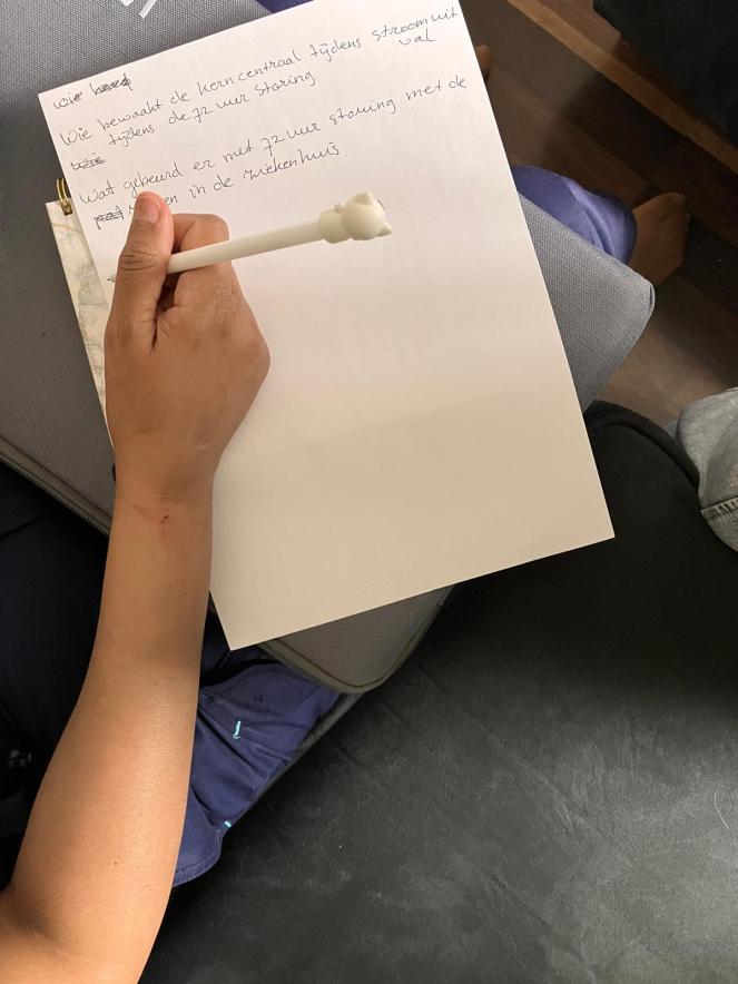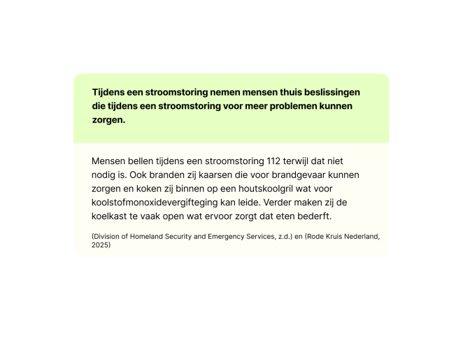 Normaal gesproken zou ik beginnen met het doen van onderzoek maar zonder een duidelijk onderwerp konden mijn team en ik niet beginnen. Er werden allerlei onderwerpen genoemd zoals overstromingen tot aan een zombie apocalyps. Uiteindelijk werd er gekozen voor het onderwerp stroomstoring en specifiek, 72 uur overleven zonder stroom. Als doelgroep werd er gekozen voor huishoudens met minimale voorbereiding op stroomstoringen en basiskennis over elektriciteit. De nieuwe ontwerpvraag die opgesteld werd, luidde als volgt: Hoe kunnen wij ervoor zorgen dat huishoudens schade voorkomen aan het huis en zichzelf, en niet in paniek raken waardoor zij onnodig contact op zoeken met hulplijnen? Mijn team en ik maakten een planning voor de komende weken en verdeelden de taken voor het doen van deskresearch. Ook werd er door iedere teamlid fieldresearch uitgevoerd. Ik ontdekte uit het onderzoek dat een stroomstoring eigenlijk geen acute noodsituatie is, maar dat mensen wel dat idee hebben. Hierdoor bellen zij onnodig 112 waardoor de centrales overbelast raken. De drie respondenten die ik interviewden hadden allen geen noodpakket in huis en hadden geen idee wat ze moeten doen tijdens een landelijke stroomstoring. Al inzichten van het onderzoek werden in een (online) research wall gezet. Later werden deze inzichten gecategoriseerd door middel van een affinity map.