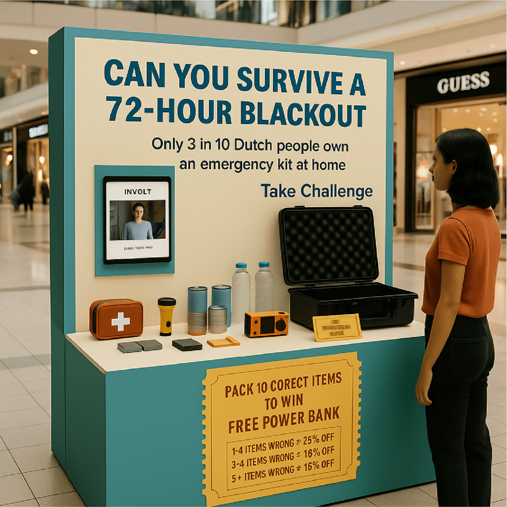 Black out koffer challenge is een stand met een scherm waar een video op afspeelt. De gebruiker moet dan producten in de koffer plaatsen die hij denkt nodig te hebben voor een noodpakket. Aan het einde ziet de gebruiker een scoreboard en krijgt hij een kortingsvoucher voor winkels waar hij noodpakketspullen kan halen. Deze stands zouden op openbare plekken kunnen komen zoals Westfield Mall of the Netherlands, wat het meer uitnodigend maakt voor de doelgroep om te gebruiken.