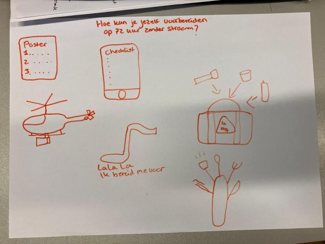 Black out koffer is een workshop met een echte koffer die meegenomen of gehuurd kan worden door scholen of bedrijven. In de koffer zitten echte noodpakketspullen. Het doel is om een stroomstoring te simuleren waarbij mensen kunnen ervaren hoe het is om zonder stroom te moeten overleven. De mensen kunnen dan zien wat er in een noodpakket moet en leren hoe zij zich moeten voorbereiden. Dit concept werd gekozen op basis van de brainstorms en prioriteitenmatrix