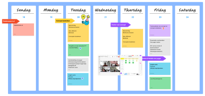 De volgende stap was het omzetten van het onderzoek in insight cards, ontwerprichtlijnen en een persona. Eerder in het project was er een poging gewaagd om statement cards te maken, alleen leverde dit niet het gewenste resultaat op. Er was namelijk verwarring ontstaan tussen insight cards en statements cards. Als team werd er besloten om statement cards te maken en hierop te itereren. Het gaat om kwaliteit en niet om kwaliteit. Liever 1 methode goed uitvoeren, dan 10 methodes halbakken uitvoeren.