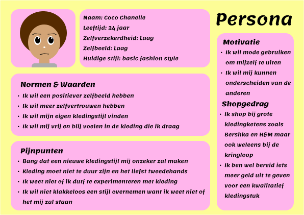 Dit was een project waarbij ik zelf de opdrachtgever was, maar ook de designer die het probleem op zou lossen. Voor de opdracht wilde ik graag iets met fashion doen omdat dat één van grootste hobby’s is. Ik wilde dat de oplossing fashion zou zijn. Ik voel me altijd een stuk zelfverzekerder als ik een leuke outfit draag. Dit gevoel wilde ik graag overbrengen aan mijn doelgroep. Mijn doelgroep was dan jongvolwassen vrouwen met een laag privézelfbeeld en weinig zelfvertrouwen. Leuk weetje, in mijn vrije tijd maak ik zelf kleding. Misschien kon mijn skills inzetten in dit project?