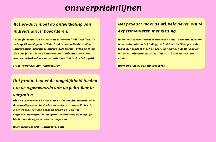 Naast de deskresearch en fieldresearch, was het voor mij belangrijk om te bepalen waar het probleem van de doelgroep lag. Ik was mijn eigen opdrachtgever en moest mijn eigen briefing maken, maar ik moest het project ook vanuit het punt van een designer bekijken. Aangezien het onderwerp fashion dichtbij mijn persoonlijkheid staat, wilde ik ook een product maken wat ik leuk vond. Het vinden van een balans hiervan was een belangrijke taak. Verder was het bedenken van concepten die totaal verschillend waren van elkaar een belangrijk taak. Maar ook ervoor zorgen dat de concepten voldeden aan de ontwerprichtlijnen. Een aantal inzichten die belangrijk waren om mee nemen waren: hoe kan kleding iemand helpen om zelfverzekerder te worden, hoe vind iemand zijn kledingstijl, wat als de gebruiker haar nieuwe kledingstijl niet durft te dragen, wordt het niet te duur om een hele nieuwe garderobe aan te schaffen? Tot slot was het belangrijk om de concepten te testen.