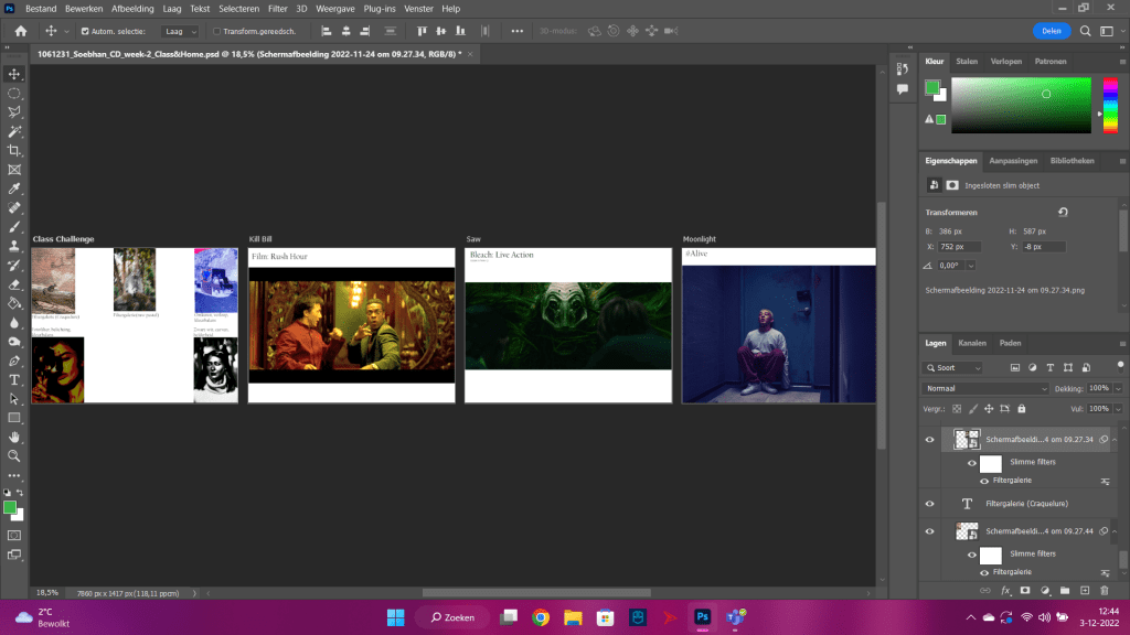 De tweede week ging meer over het photoshoppen van, je raadt het al, foto’s. Hierbij moest ik vijf foto’s bewerken voor de class challenge. Ik speelde bijvoorbeeld met de lichtsaturatie maar ook met het kleurencontrast. Voor de home challenge moest ik scenes uit film in de stijl van een andere film photoshoppen. De film Kill Bill maakt veel gebruik van gele accenten. Ik koos de film Rush Hour en maakte deze in de stijl van Kill Bill dus met gele accenten. Verder heb ik Bleach: The live action in de stijl van de film Saw gemaakt, met groene accenten. Tot slot heb ik de film #Alive in de stijl van Moonlight gemaakt, die weer blauwe accenten heeft.