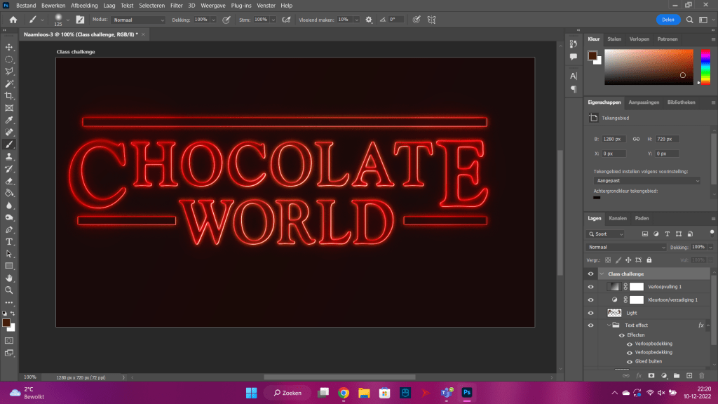 Stranger Things, de bekende serie. Ik kreeg twee opdrachten in het thema van de serie. Allereerst moest ik het iconische logo van de naam namaken met een ander woord. Ik koos voor de woorden Chocolate world. Ik moest een video kijken en de stappen volgen om een exacte replica te maken.