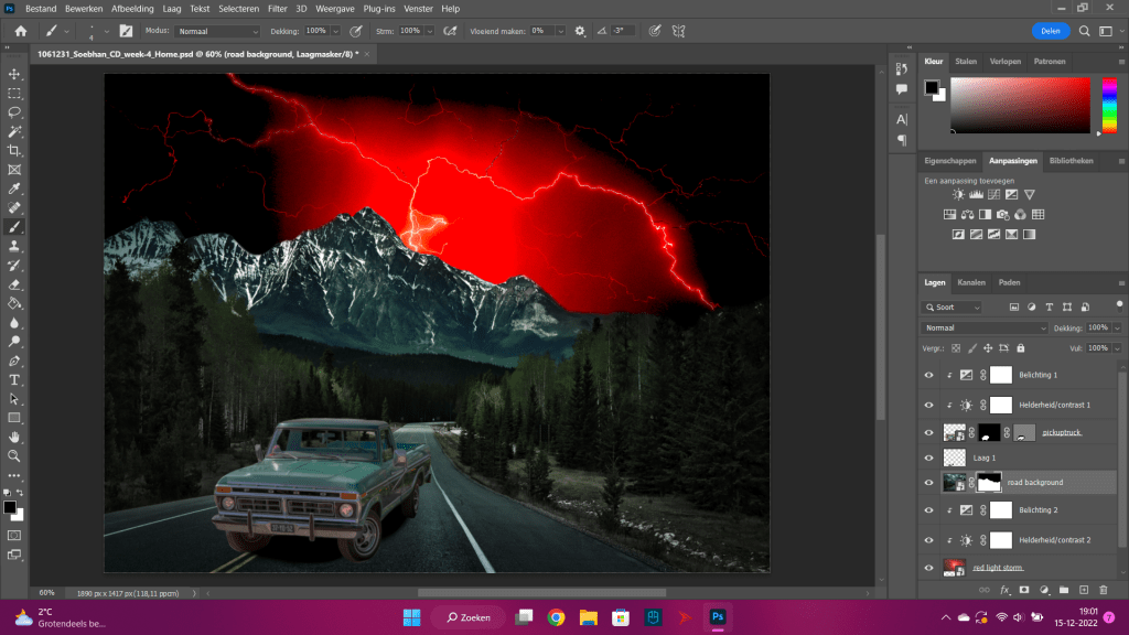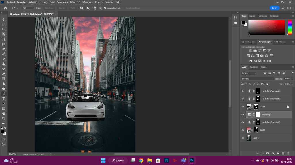 Voor de eerste opdracht moest ik leren omgaan met de tools en drie foto’s met elkaar photoshoppen. Ik moest de roze lucht en de auto photoshoppen in de de stad. Onder de auto heb ik ook nog een schaduw toegevoegd om het realistischer te maken. Dit was nog een hele klus en niet makkelijk om te doen. Toch is het mij na een aantal uur photoshoppen wel gelukt.