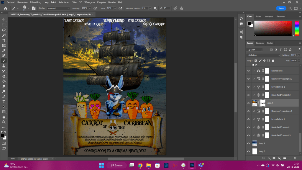 Ik moest een filmposter maken maar wel met een twist. In plaats van een bestaande poster na te maken moest ik naam van de film een twist geven en daarmee een filmposter maken. Ik koos voor de film Pirates of the Carribban en veranderde dit naar Carrot of the Caribbean.