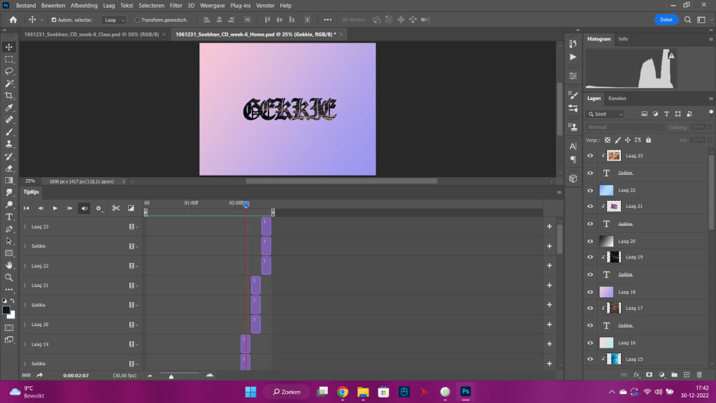 Voor de tweede gif moest ik gebruik maken van een woord en deze op verschillende manieren maken. Dit zou voor een cool effect moeten zorgen. Ik koos voor het woord gekkie.